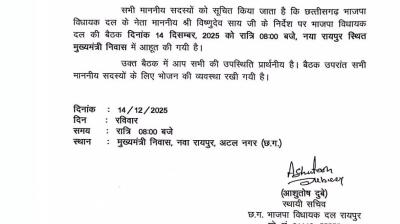 रायपुर : में BJP Legislature Party Meeting को लेकर राजनीतिक सरगर्मी तेज हो गई है। छत्तीसगढ़ भाजपा विधायक दल की अहम बैठक कल, 14 दिसंबर 2025 को आयोजित की जाएगी।...